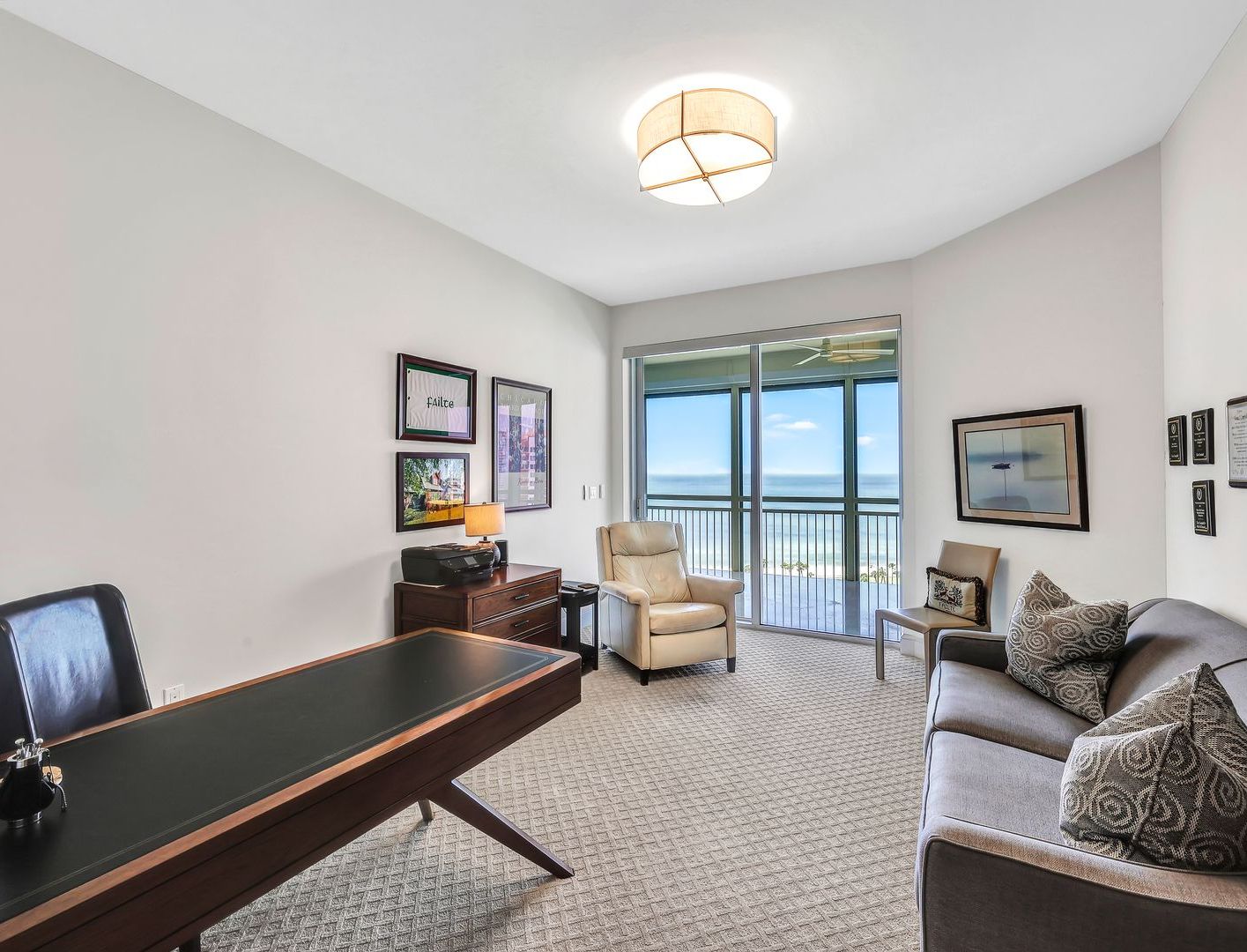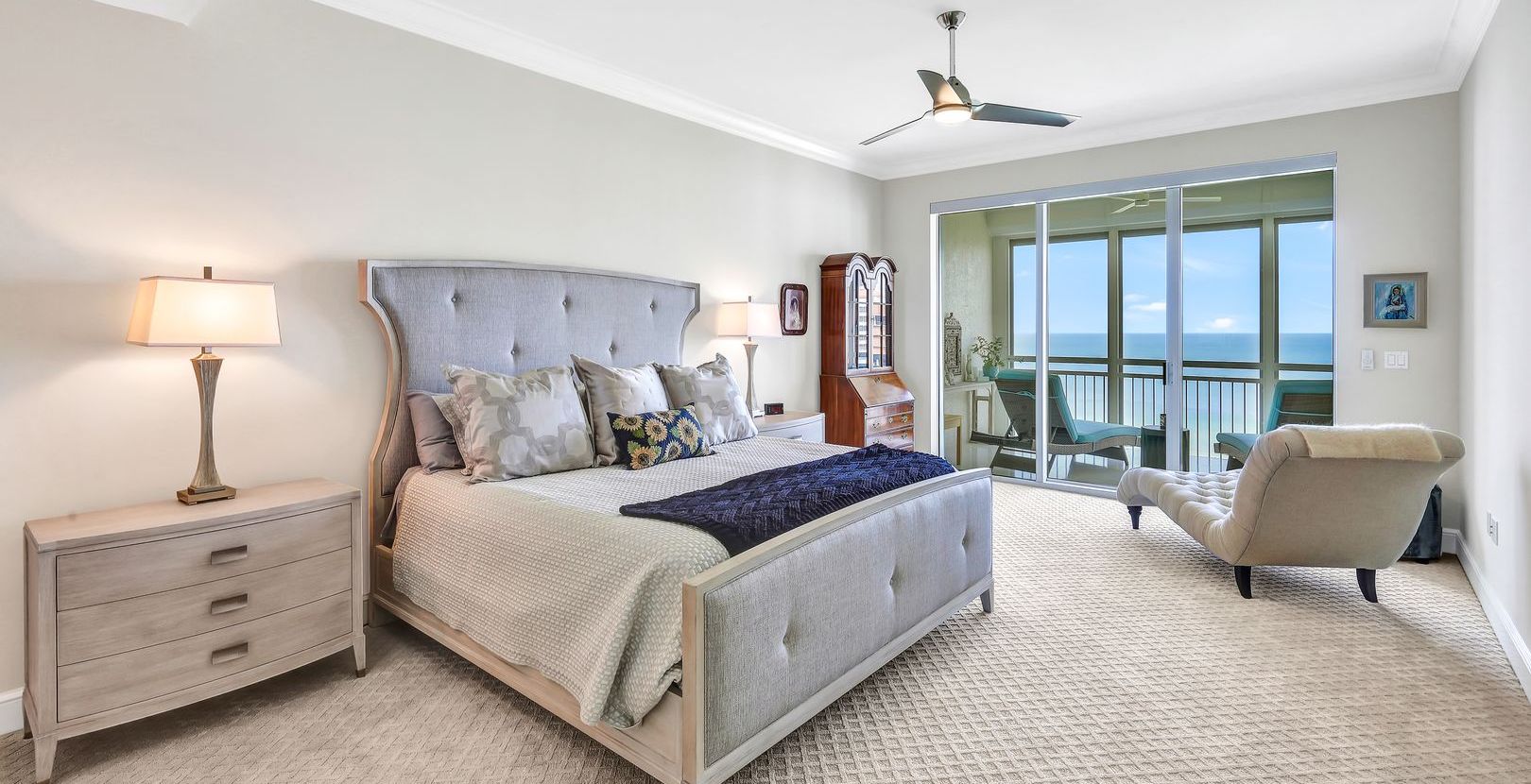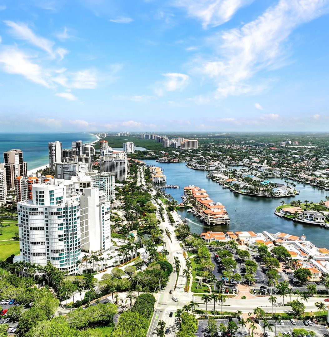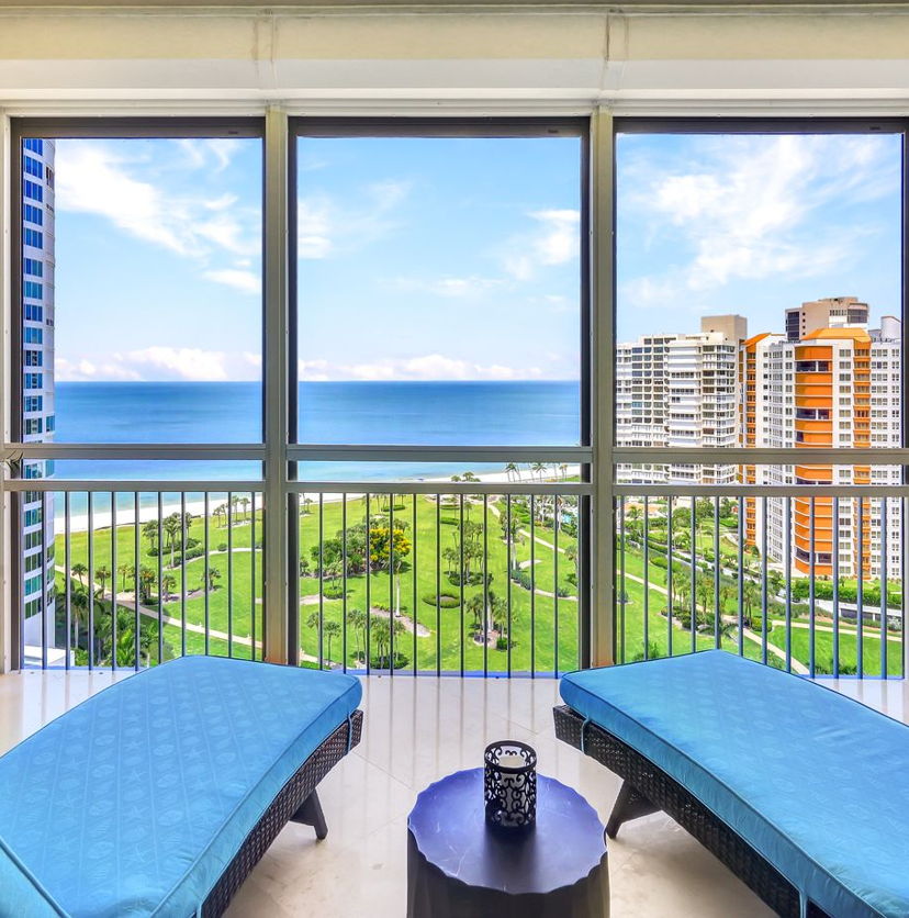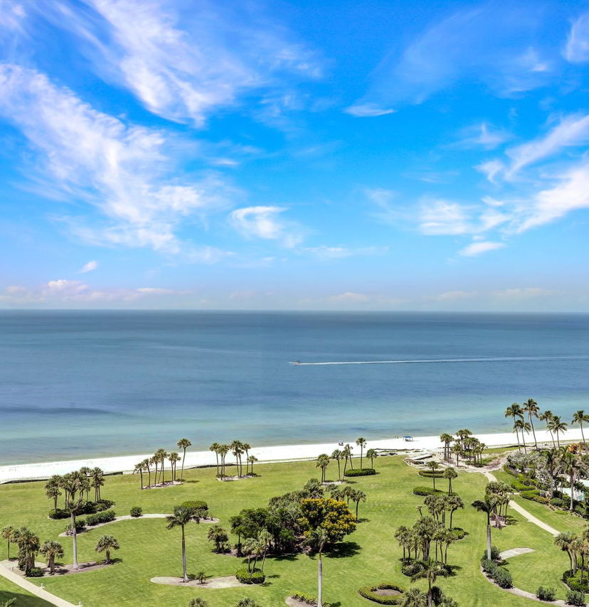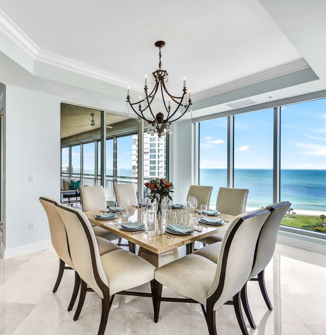 The open-floor concept features West-facing floor-to-ceiling windows showcasing the beautiful white sand beaches, the blue waters of the Gulf, Naples’ cityscape, and bay views from the formal living, dining, kitchen, and family rooms. Whether watching the sunrise with your morning coffee or enjoying the spectacular sunsets with your favorite beverage, you will never want to leave your new home!